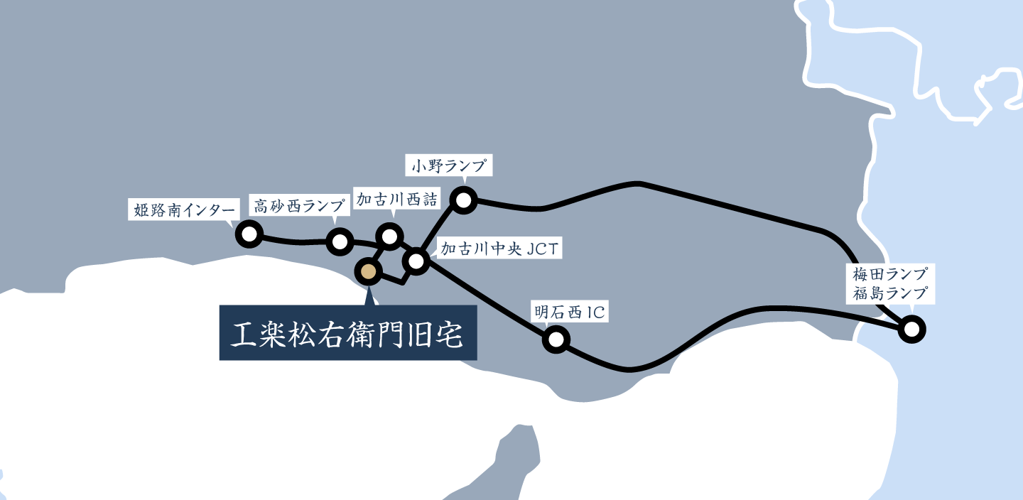 姫路南インター〜高砂西ランプ下車、下道で併設駐車場まで約10分