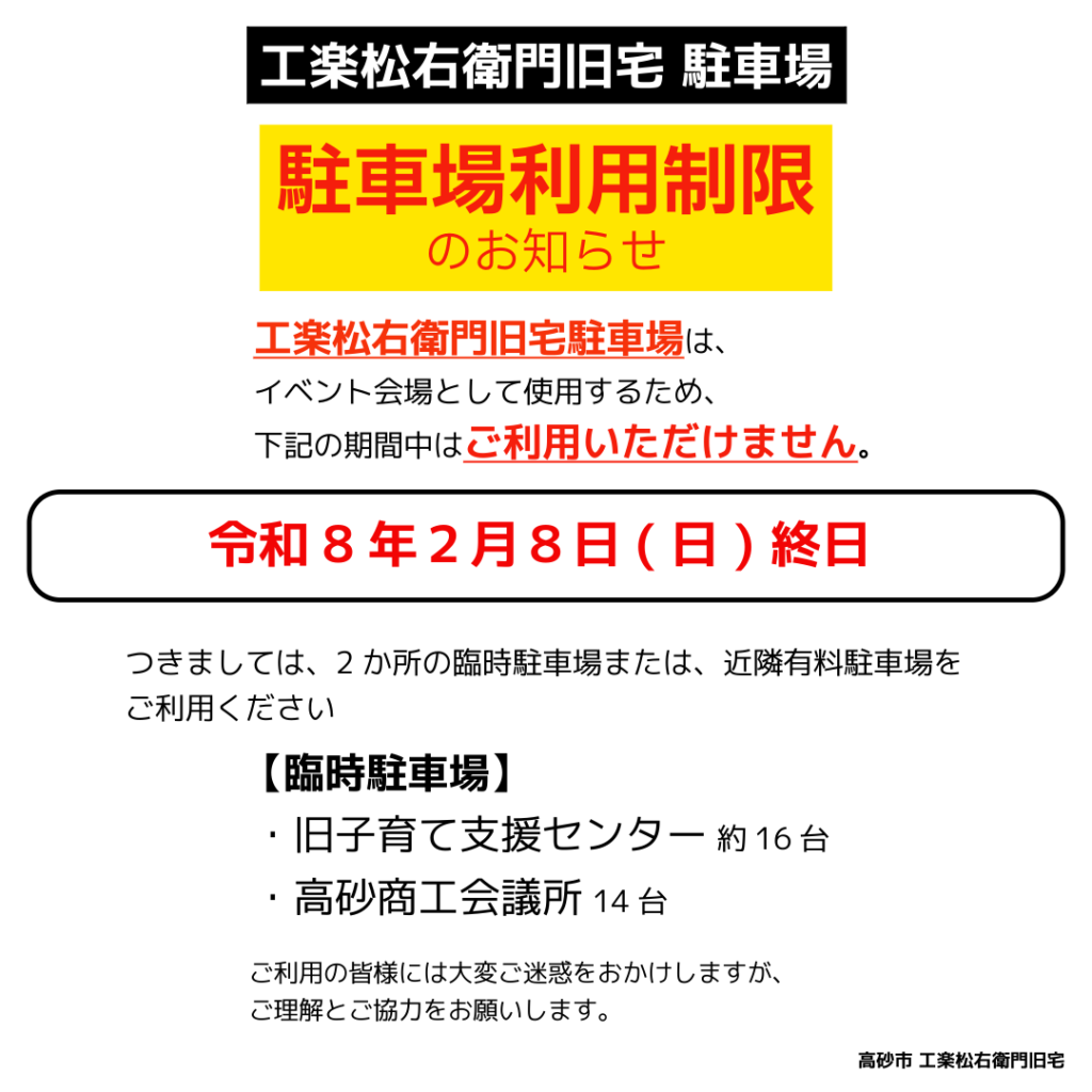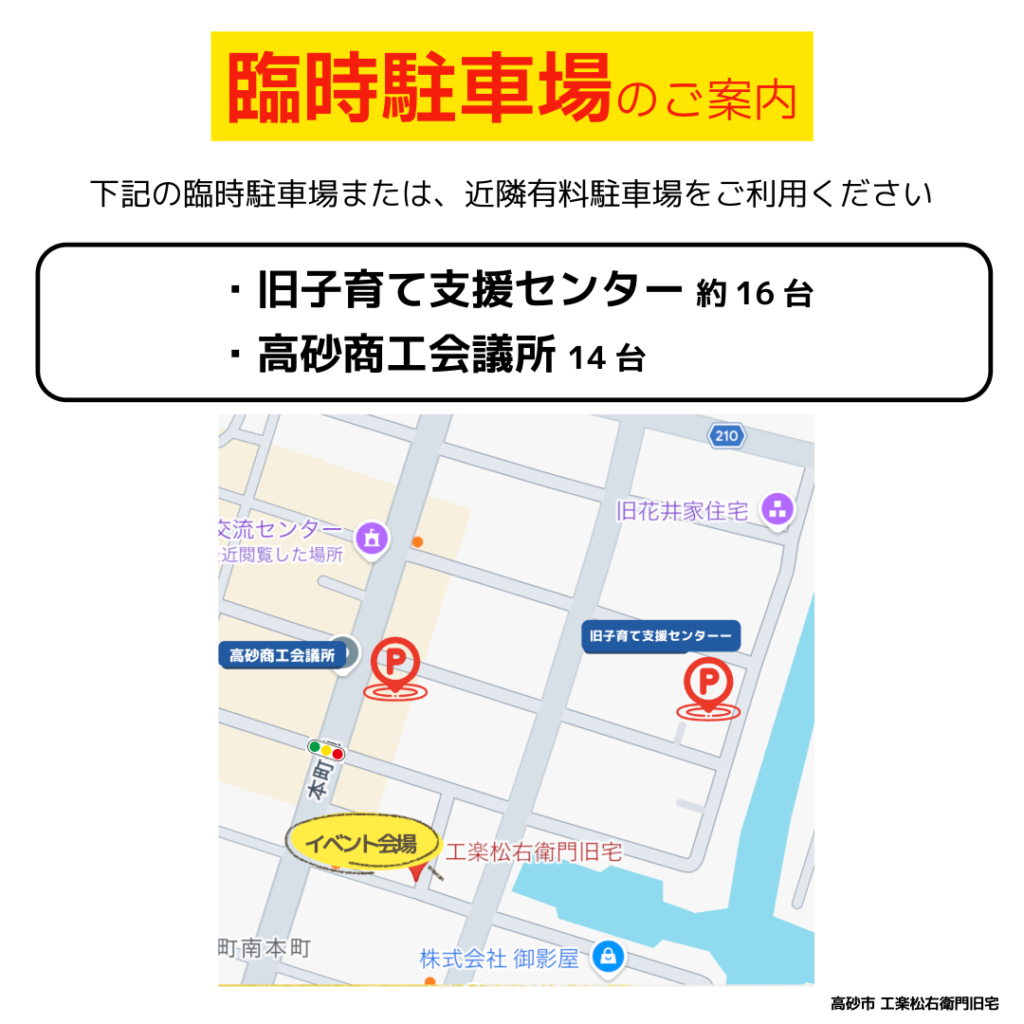 工楽松右衛門旧宅駐車場をイベント会場として全面使用するため、ご利用いただけません。